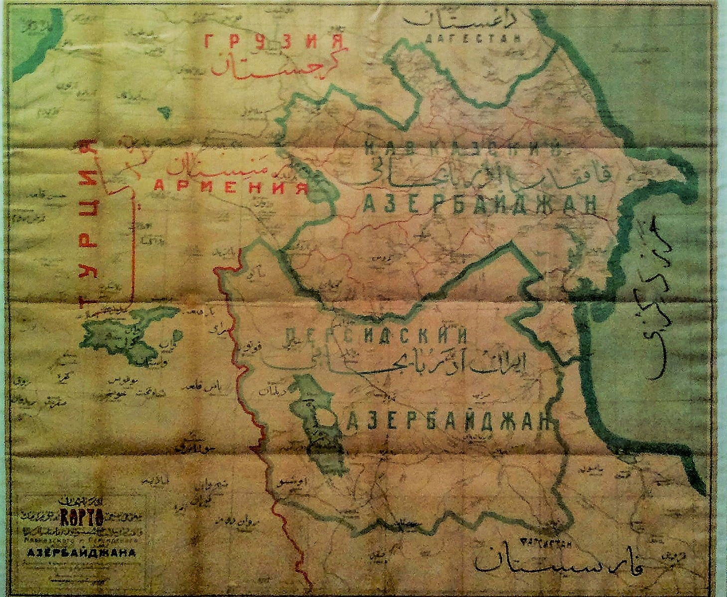 1918 هذه “الخريطة” التي اخترعها البانتوركيون محفوظة في متحف التاريخ الأذربيجاني في باكو ،وهي تظهر الطموحات الإقليمية لـ “أذربيجان القوقازية” ، التي دخلت التاريخ لأول مرة على حراب نوري باشا التركية من نفس العام.