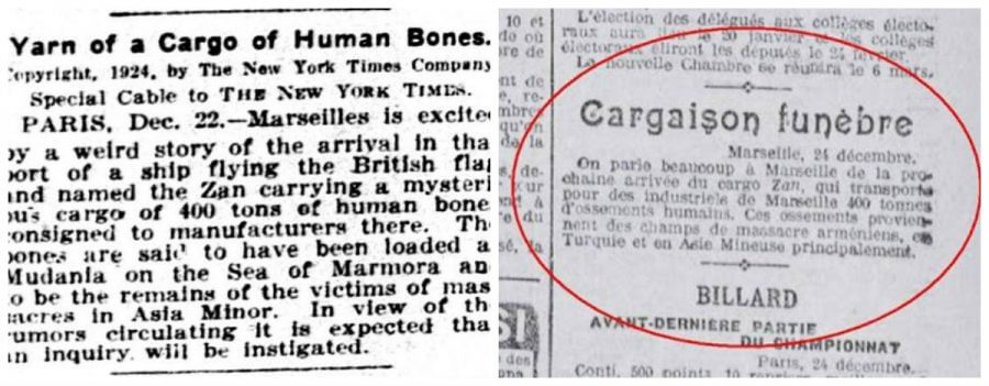 ووفقا للتقارير، فقد تم بيع عظام اليونانيين من قبل الأتراك إلى الفرنسيين للاستخدام الصناعي. في المجموع، تم نقل 400 طن من عظام بشرية، وهو ما يعني عظام 50.000 شخص، إلى الصناعات الفرنسية في مرسيليا. في 13 ديسمبر 1924، وصل قارب يحمل علما بريطانيا إلى تسالونيكي، اليونان. وعندما أُبلِغ العمال في الميناء بأمر العظام، لم يسمحوا بمغادرة القارب. سرعان ما كانت هناك مظاهرات في المدينة من قبل اللاجئين، الذين طلبوا الاستيلاء على الشحنة.
