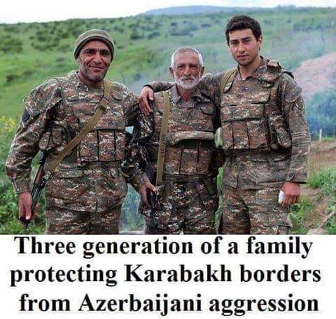الصورة تعبر عن ثلاثة أجيال من عائلة واحدة لحماية حدود آرتساخ من التجاوزات الأذربيجانية.