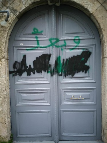 بتاريخ 23 شباط عند حوالي الساعة العاشرة والنصف تم كتابة نقوش عربية وإنكليزية ذات محتوى عرقي وتحرض على الكراهية على  الباب الرئيسي لكنيسة رئيس الملائكة في بالاط.