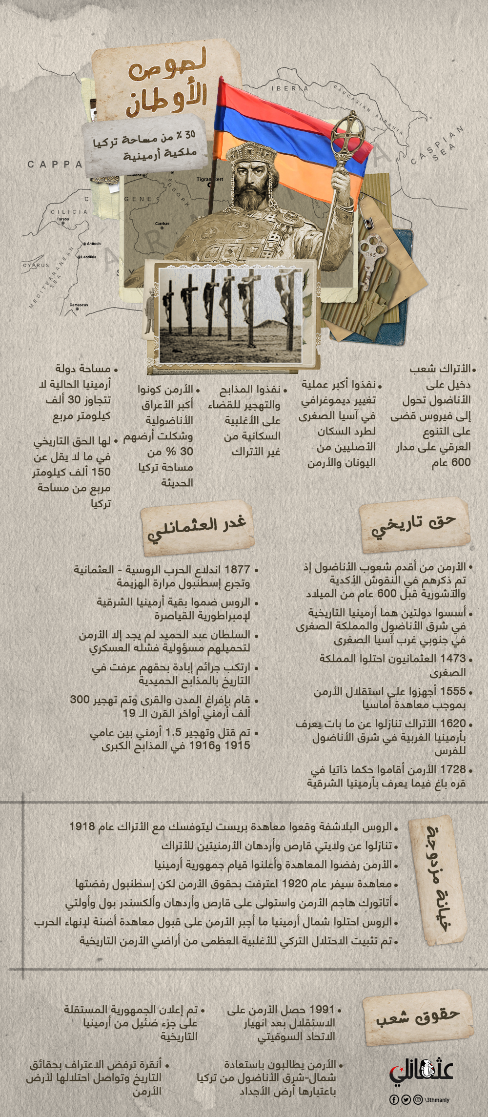 البلاشفة طعنوا الأرمن في الظهر واحتلوا شمال أرمينيا بالاتفاق مع الترك، وصارت أرمينيا جمهورية تابعة للاتحاد السوفيتي منذ عام 1921، لكن بعد تفكك الاتحاد السوفيتي عام 1991 تم إعلان قيام جمهورية أرمينيا، وتم إطلاق مصطلح “أرمينيا الغربية” للإشارة إلى الأراضي التي تطالب بها أرمينيا في شرق تركيا وهي “طرابزون و أرزنجان وموش وبتليس”، والتي تمثل 30 % من مساحة الأناضول.