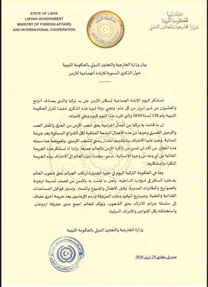 استنكرت وزارة الخارجية والتعاون الدولي بالحكومة الليبية عمليات القتل الجماعية التي قامت بها تركيا بحق الشعب الأرمني إبان الحرب العالمية الأولى..