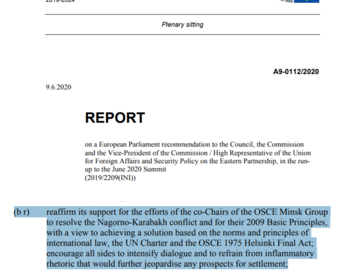 وتجدر الإشارة إلى أنه مع جهود مكتب لجنة متابعة القضية الأرمنية التابعة لحزب الطاشناق في أوروبا وبعثة أرمينيا في الاتحاد الأوروبي، تم تعديل النسخة الأولية من القرار التي تضمنت قسمًا منفصلاً حول نزاع ناغورنو كاراباخ ، حيث أكد البرلمان الأوروبي دعمه لمجموعة مينسك التابعة لمنظمة الأمن والتعاون في أوروبا. الجهود المبذولة لحل الصراع والمبادئ الأساسية لعام 2009.