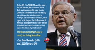 واشنطن – بعد انزعاجه من برنامج المساعدات العسكرية الأمريكية لأذربيجان الذي ارتفع إلى أكثر من 120 مليون دولار على مدى السنوات المالية الثلاث الماضية ، طلب السيناتور بوب مينينديز (ديمقراطي – نيوجيرسي) الأربعاء رسميًا بأن يقدم مكتب المساءلة الحكومي لجنة العلاقات الخارجية بمجلس الشيوخ تقريرا مفصلا عن برنامج المساعدة هذا …