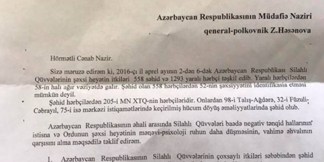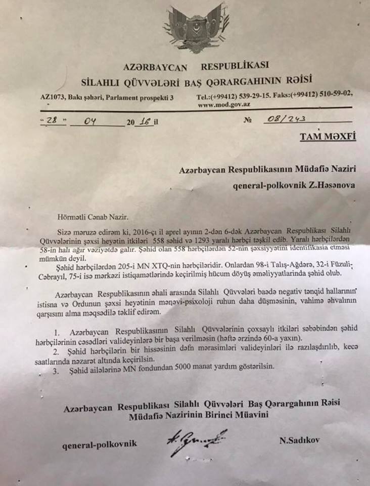 في تقرير بتاريخ 82-4-2016 إلى وزير الدفاع الأذربيجاني يورد نائب وزير الدفاع الأذربيجاني ورئيس أركان القوات العسكرية الأذربيجانية خسائر الجيش في العديد في الفترة 2 إلى 6 نيسان 2016 بما يلي: