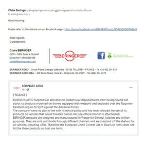 الرئيسية / القفقاس / أرتساخ/ناغورنو غره باغ / أعلنت Beringer AERO أنها علقت جميع عمليات تسليم الطائرات التركية بدون طيار.